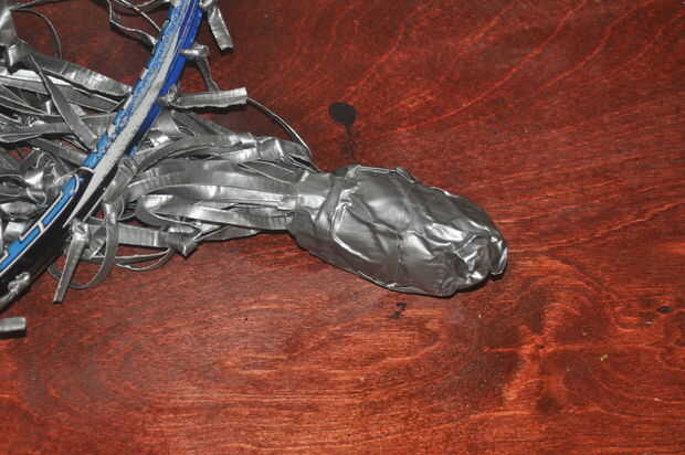 a continuación, toma un pedazo largo de cinta del conducto y enróllelo alrededor del nudo del lazo en la parte inferior, que está completamente cubierto. Luego, tome otro trozo largo de cinta del conducto y envuélvalo alrededor de la tapa para que cubra los nudos de rizo que mantenga las tiras en su lugar. Puse dos trozos de cinta adhesiva alrededor de él para la fuerza adicional.