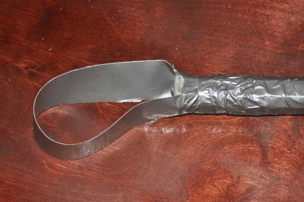 Para hacer el mango, primero toma un pedazo largo de cinta del conducto. Luego, tome un pedazo un poco más pequeño de cinta adhesiva y unir las dos partes pegajosas. Debe tener un pequeño pedazo del lado adhesivo a cada lado de la correa. Coloque la correa en la parte inferior de la empuñadura de la raqueta de modo que el lado adhesivo de la cinta se adhiere a la manija de la raqueta. Entonces, cubrir el mango de la raqueta en más cinta adhesiva, especialmente la zona donde se une el mango de cinta del conducto, para que la manija de cinta del conducto está ahora segura. El lazo debe ser lo suficientemente grande como para caber su mano a través de. El mango es bueno porque puede fijar en el cinturón, colgar en algún lugar o asegúrese de que la red no se caiga en el agua.