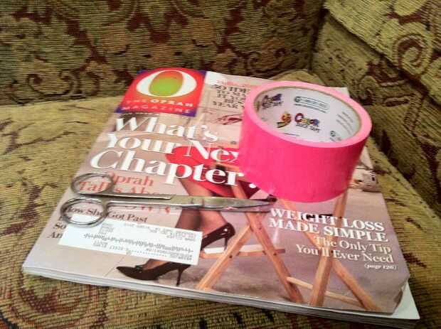 Todo lo que necesitas es un rollo de cinta adhesiva y una revista de su elección. Creo que esto se ve mucho mejor si usted puede encontrar una revista con un anuncio que es sobre todo un color. También, para las piezas cortas de papel me recomienda el uso de la parte posterior de una revista porque es un poco más gruesa y mucho más que las páginas dentro de la revista.