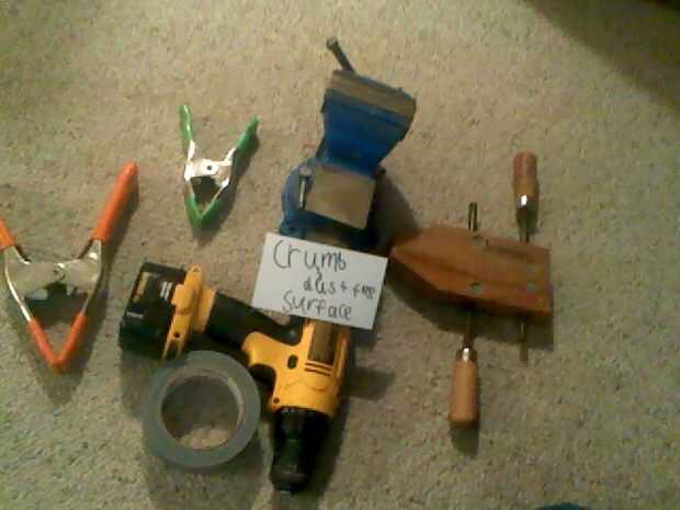 una superficie para migas y el polvo para la cuerda más corta, una abrazadera de tamaño medio y superficie para la cuerda de mediados y un pequeño agarre o una abrazadera fuerte grande