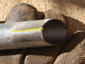 2. moler el área que calienta. Usar una almohadilla de la aleta en una amoladora de ángulo, una rueda de alambre en un taladro eléctrico o un removedor de pintura abrasiva para este paso. Hacerlo fuera. (Foto #1) El resultado es una superficie brillante y brillante de acero (Foto #2 debajo de la línea amarilla)