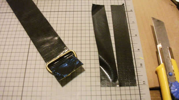 Para conectar a la bolsa, corrí cada extremo a través del metal hebillas y coloca sobre. Luego de cortar una tira de cinta negra en medio longitudinalmente y utilizado las dos secciones para sujetar la correa alrededor de las hebillas. El cuadro cuatro últimos demuestran lo que quiero decir con un anillo en d repuesto.