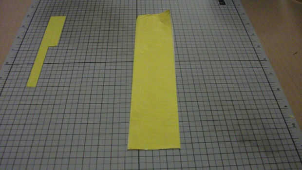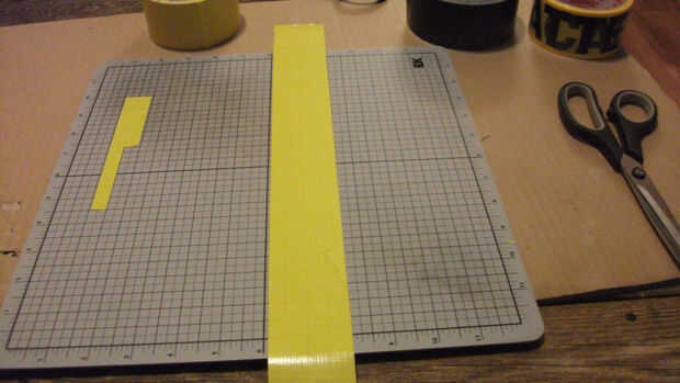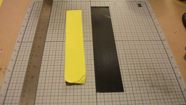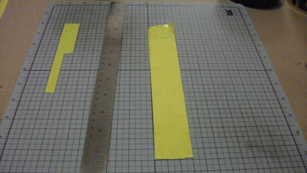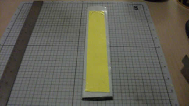 Una vez que la cinta amarilla de hecho, ajustado en la almohadilla de corte utilizando una regla como un borde recto hasta poco menos de 1 1/4" pulgadas de ancho por toda la longitud de la misma.