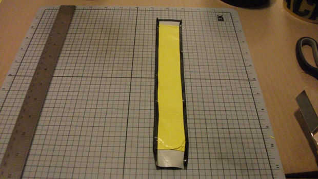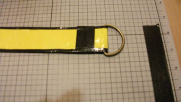 Entonces sacó una tira de cinta negra un poco más de la correa amarilla acabo hecho y había establecido lado pegajoso hacia arriba. Yo con cuidado centrado en la correa de la cinta amarilla por encima de él y entonces presionado en ella una sección en un momento hasta que tuve lo entera hecho. Esto me dejó más o menos 1/4" de cinta negra a cada lado que doblado para arriba y para hacer un ribete negro a lo largo de la correa todo.