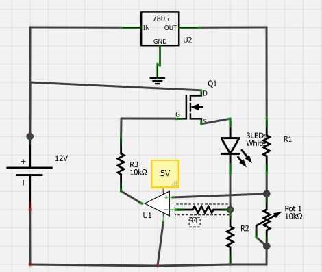 Para saber cuanta corriente en los LEDs que necesitamos VPot1 * R2. Máxima luminosidad y con R2 = 1 ohmio, 0.1V * 1 = 0.1A o 100mA.