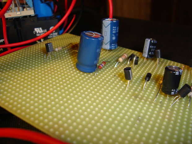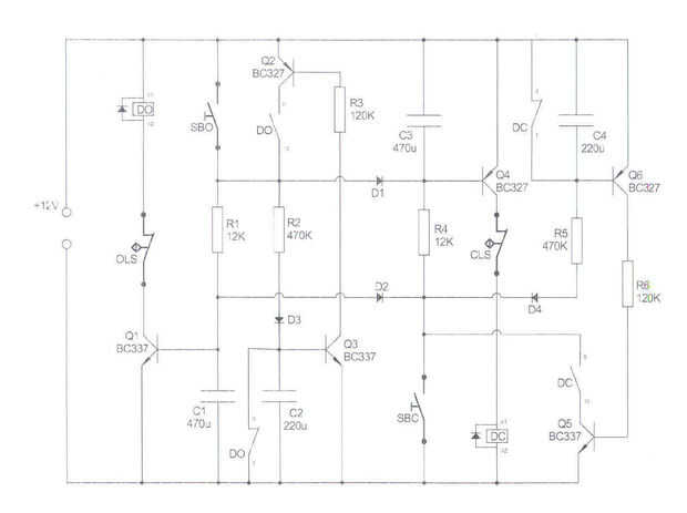 diseñado para propósito experimental este circuito de lógica de relé pueden trabajar en combinación con un motor de cortina onduladas. El circuito consta de dos relés monoestables, dos interruptores momentáneos y algunos componentes básicos. Dependiendo de la duración del empuje, el motor funciona manualmente o automáticamente. Si la presión dura durante 4 segundos o menos el motor se detiene una vez que el botón es liberado. Si el botón se pulsa durante más de 4 segundos el motor mantiene en y puede interrumpirse pulsando brevemente el botón de dirección opuesta. Ningún relé funciona si se presionan ambos botones. En la imagen se puede ver el circuito de control.
