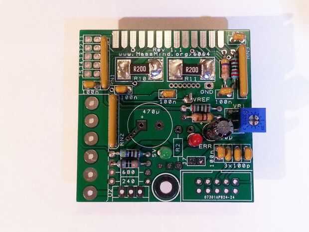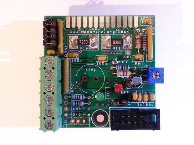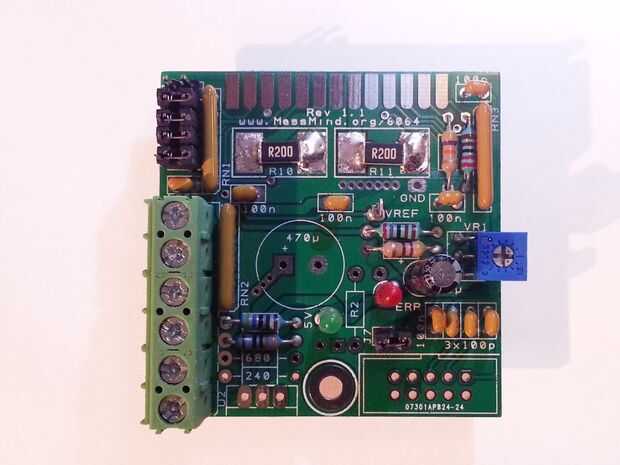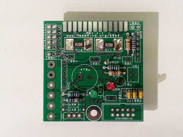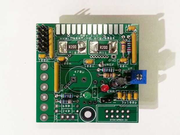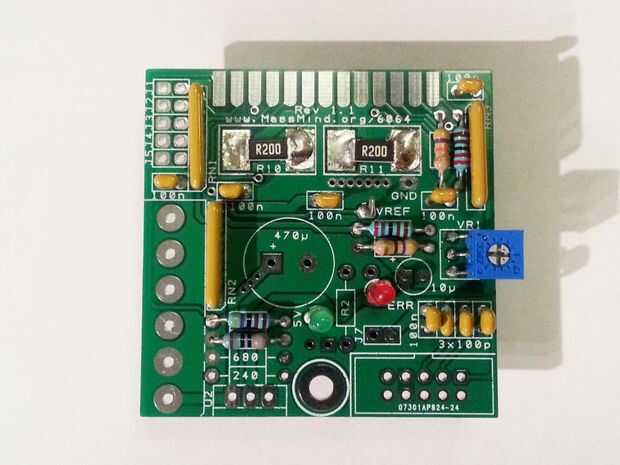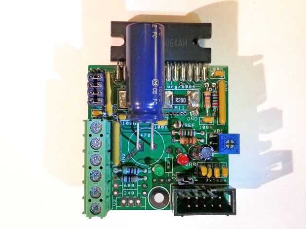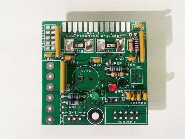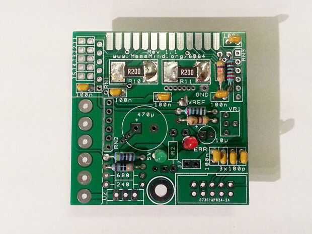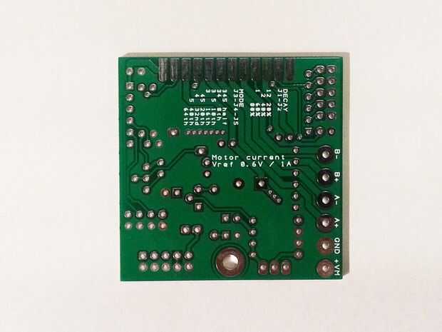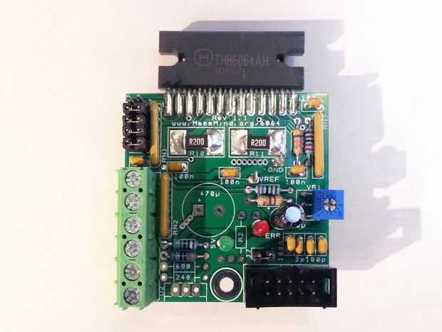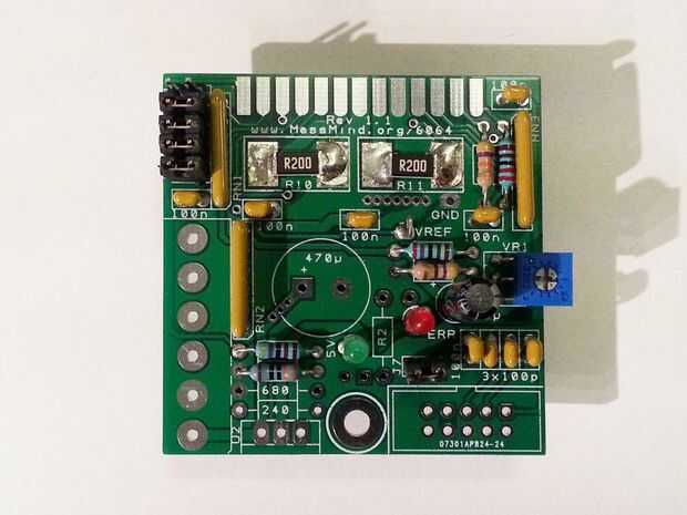 Asegurar la placa en una morsa y plan de la orden que se soldar los componentes. Comience con los dos R200s montado superficie y prueba clavijas en VREF y GND. A continuación soldar los LEDs, las pequeñas resistencias, los condensadores pequeños, las resistencias de la red, potenciómetro, condensador medio, puentes, bloque de terminales, luego la cabecera envuelta. En general comencé con los componentes más pequeños y progresivamente trabajó hacia los más grandes. En este punto Alinee las clavijas de THB6064AH en sus puntos respectivos de la soldadura y asegurar que el chip también está alineado apropiadamente en relación con los tres agujeros en el disipador de calor. Después de soldar el chip y luego doblar las patas del condensador grande y soldadura en último.