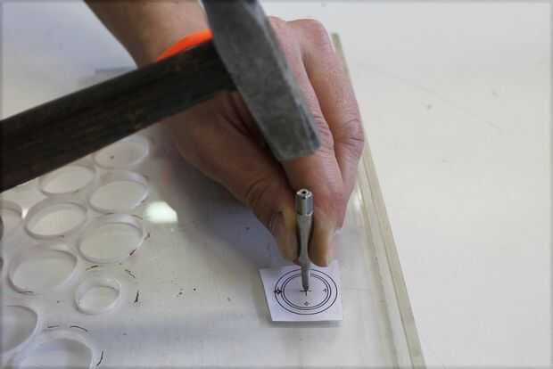 -marcar la hoja de plexiglás en la correspondencia de los cinco X usando un pin y un martillo