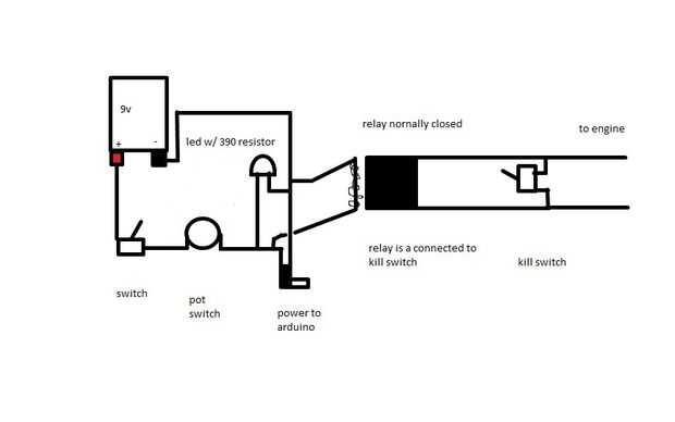 abajo es un diagrama de cómo voy a poder a arduino. de esta manera el motor sólo arranca Si está encendido el arduino. el primer interruptor se monta en la caja que contiene el arduino. el potenciómetro que tengo tiene un interruptor para activar el arduino que tenga que llevar el interruptor a la caja y luego gire el potenciómetro. usé el led como luz de estado para avisarme que arduino está encendido. usé el relé como un interruptor de matar porque si algunos cómo murió la batería de arduino y el acelerador se abrió completamente, sería muy difícil de detener. También puse en una llave manual. También a continuación es lo que realmente hice.