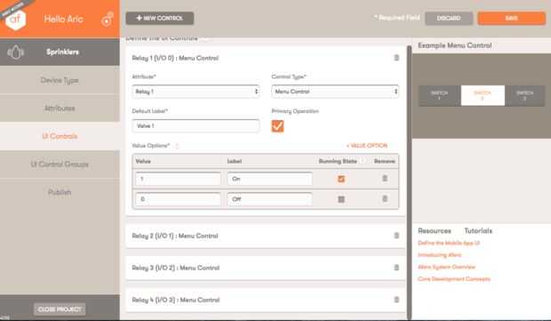 Haga clic en la pestaña de navegación de controles de interfaz de usuario y haga clic en + Control nuevo. Seleccione el menú de Control y haga clic en Agregar. En el atributo, seleccione relé 1 y darle un nombre (1 válvula). Crear la primera opción de valor como etiqueta del valor: 0: apagado. Luego haga clic en + valor opción de añadir el segundo estado de valor: 1 y en la etiqueta.