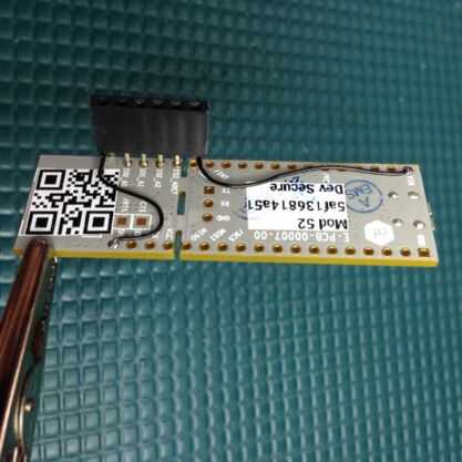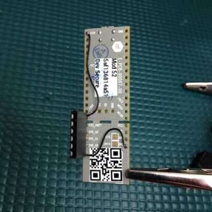 A continuación, queremos conectar las dos clavijas de cabecera doblada a la masa (GND) y 5V (VIN) a través de agujeros en la placa del Modulo. El pin GND es justo enfrente de la GPIO0 (I00_A0) en el Modulo, la entrada de 5VCD es el pin muy superior en el mismo lado de la cabecera. Usé un pedazo fino de alambre aislado para esto. Asegúrese de conectar los cables GND y 5V a los pernos que coinciden con el conector del relé.