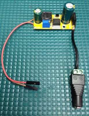 Comience soldando los cables a los AC/DC entrados agujeros en el Convertidor Buck (hilos de fondo en la foto de arriba). Pele los extremos de estos cables y conectar uno a cada terminal en el convertidor de conector de barril. Puesto que la fuente de alimentación proporciona voltaje de CA, no importa cual cable va a que conector. A continuación añadir puentes al lado de salida en la parte superior. Estos se deslicen en el GND y Vcc pernos eso palillo encima de tu Modulo board - pero no conecte todavía!.