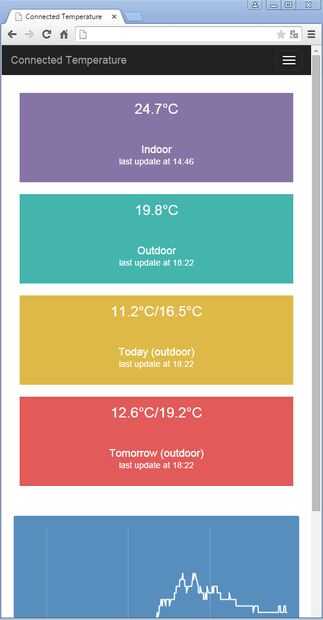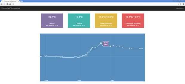 Temperatura conectado es una estación dedicada a la temperatura. Alojados en su frambuesa pi, usará el sensor de DHT22 para recoger la temperatura interior. Utilizará Internet para al aire libre temperatura (y las de los días siguientes).