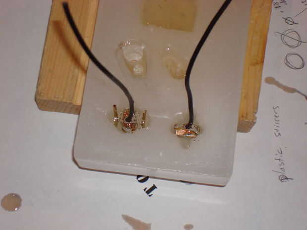 Los imanes fueron soldados a un trozo de cable de 18 ga antes de ser colocado en los moldes. Dejé sobre un 1/32" alrededor de los imanes como sea posible aislarlos.