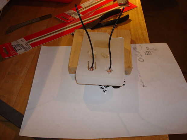 En este tiempo que también he decidido que quería fresco LED verde indicar que el poder estaba conectado (prod otro de mi esposa!), por lo pasado de moda por unos LEDs de algunos componentes SMD tenía por ahí (eventualmente cuando aprendo a AVRs de programa, que vas usando para proyectos de la luciérnaga). Como se puede ver, son fáciles de montar, siendo tan pequeño. Inicialmente sólo les soldamos los extremos de cátodo a los imanes y el plomo del ánodo sobresale ligeramente por encima del nivel del epoxy a la izquierda. Esto se hizo para que no tenga que molestar a los terminales de latón que se realizaron sólo provisionalmente en lugar de ser pegado en la cera. Después de curado el epoxi, había soldado un pequeño puente desde el cable de LED a los terminales de latón. Había pensado fuera, habría hecho los cables más largos y sólo sobre había doblado a la terminal de brass en este punto.