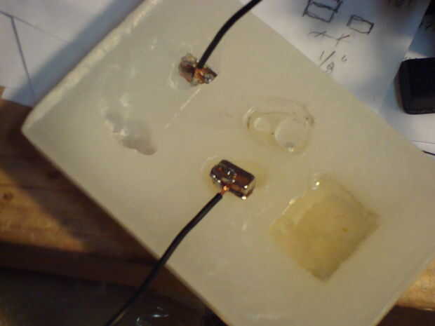 La segunda foto no es muy precisa, como los terminales de ánodo de latón fueron agregados antes de verter en el epóxico. Los moldes fueron hechos usando los pedacitos de taladro para cerdo el principal diseño de los conectores, usando un cuchillo XActo para refinar el diseño. Resulta que, me olvidé de "refinar" el molde de conector de salida lateral, por lo que terminó siendo solo un agujero de 1/2" flanqueado por orificios de 3/8", pero resultó bien.