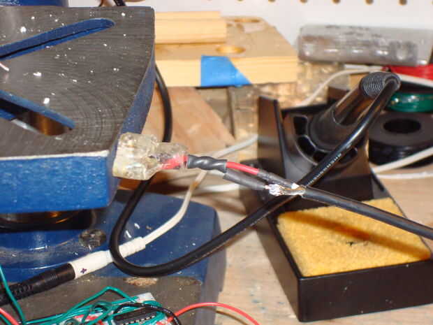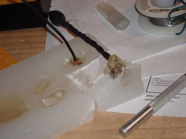Ahora los conectores se hacen bastante, pero todavía están expuestos todos los terminales positivos de soldado (y clavos sueltos) en los lados del cable de los conectores. Para cubrir éstos, me perforó una 1/2" a través del agujero en el bloque de cera y forma la parte inferior para el lado de alambre (donde yo a soldar todas las conexiones positivas) de los conectores. También hice un poco extra que forma el agujero para hacer el epoxi forma cónica hasta el orificio de 1/2". La parte inferior del bloque de cera, con los dos conectores que se pega hacia fuera (casi completamente) entonces fue sellada con cera derretida (o así que pensé), y epoxi fue vertido en el orificio de 1/2" en la parte superior.