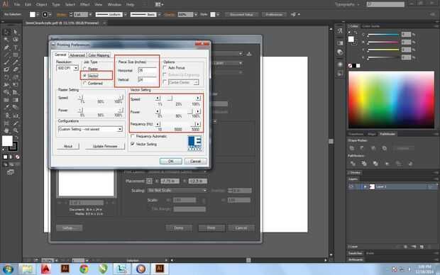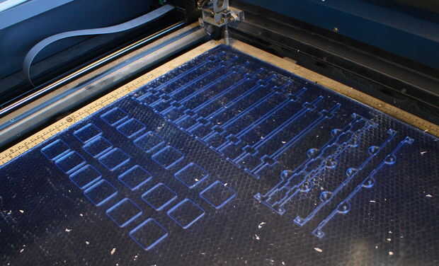 En primer lugar, coloque correctamente el 1/8" acrílica transparente en el cortador del laser. Descargar el archivo adjunto, que incluye las pautas de la Junta piezas de soporte vertical deslizante y pedazos del juego, y enviarlo a su cortador del laser. El patrón incluye siete soportes verticales y dos extra en el caso de algunas grietas, pedazos de cursor superior e inferior que se atornillan juntos, y dieciocho eliminar piezas de juego. La configuración de su corte depende el cortador del laser que se utiliza. Utilicé un cortador láser de Epilog 120 vatios con la configuración de set a los de la imagen incluida.