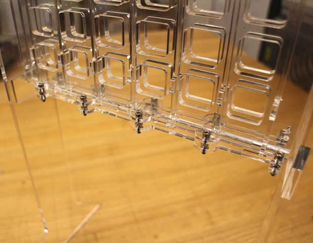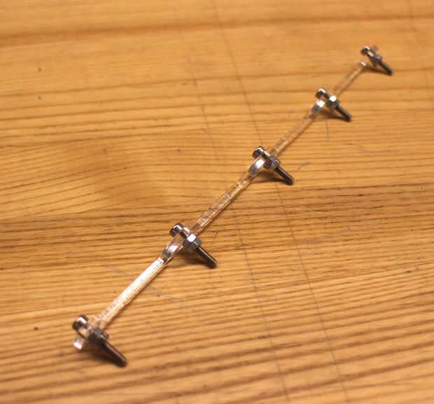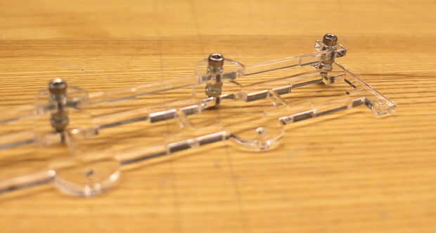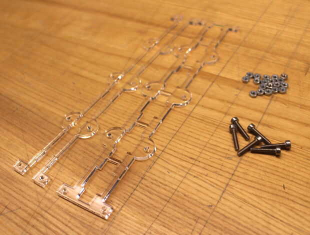El control deslizante de sujetadores en la parte inferior de la junta vertical de 4 conectar. Se hace de tres piezas total: dos principales piezas que enrosque en una pieza de la parte inferior. Monte el regulador apretando tornillos de cabeza hexagonal 16mm M3 socket en los agujeros de las piezas superiores. Fíjelos a la pieza superior con dos tuercas hexagonales de M3, que también actúan como espacios. Finalmente, el extremo restante del tornillo en la pieza de deslizador inferior del hilo de rosca y seguro hacia abajo con una tuerca hexagonal.