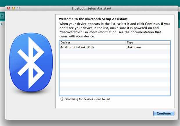 - Una lista de cerca de los dispositivos surgirán Seleccione su Bluefruit debería llamarse algo como "Adafruit Ez-link"