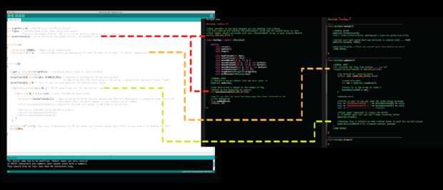 Por favor, consulte el diagrama anterior del código donde hemos resaltado las conexiones importantes entre los dos dibujos.