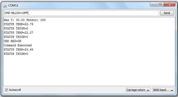 Arduino escucha los comandos a la luz algunos LED o mostrar su estado. Además, una interrupción de timer hace Compruebe la temperatura mediante un sensor TMP36: Si la temperatura es mayor que un umbral se enciende un LED; cada n segundos (donde n es un parámetro establecido a través de la aplicación) un informe se envía a la aplicación. Una estructura de mando simple permite la aplicación enviar parámetros y valores a Arduino y a la redonda.