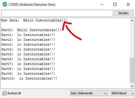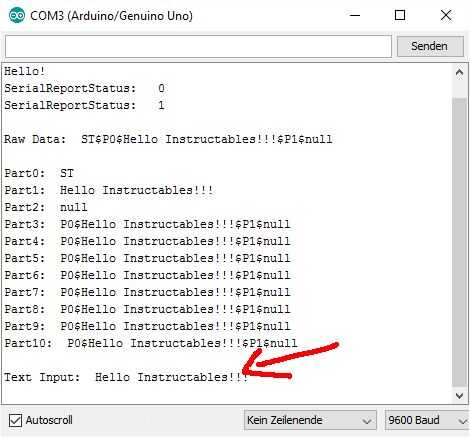 Asegúrese de tener su Arduino conectado a su PC y abrió al Monitor serie. Ahora escribe algo en el cuadro de texto y golpear "Enviar". Debería ver lo que escribiste que aparecen en el Monitor serie. Escriba "informe" en el Serial Monitor para obtener más información acerca de la transmisión.