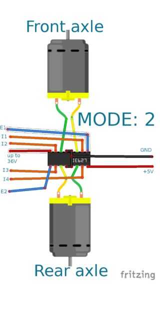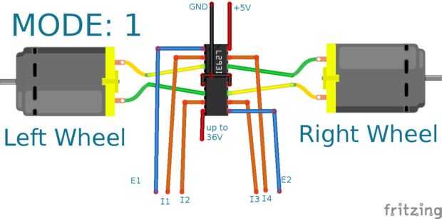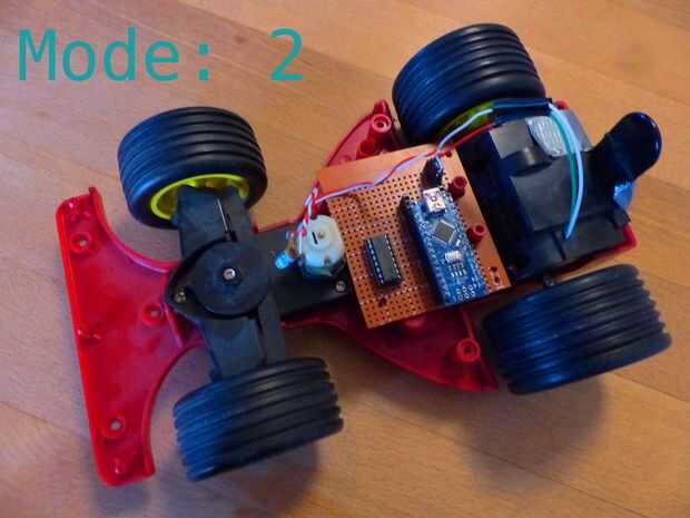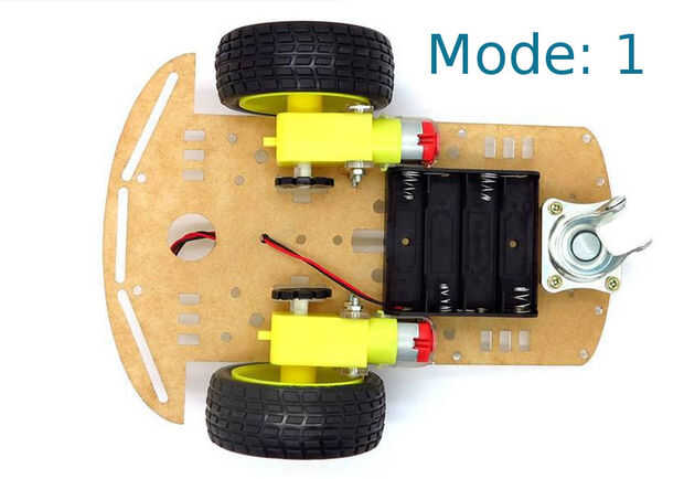 ROBOTS!!!!!! ¿Que no le gusta Robots? Así que aquí me centraré en dos de los muy simples. Ambos se mueven con dos motores de corriente continua. La primera one(Mode: 1) tiene un motor a la izquierda y uno en la rueda derecha. El second(Mode: 2) tiene uno en el eje trasero que se mueve el robot hacia adelante y uno en el eje delantero que decide en cual dirección el robot se mueve. Utilizar los motores con un controlador de motor l293d, pero debería funcionar cualquier otro chip controlador compatible. Pero si su chip controlador no tiene "activar" pines o que simplemente les conectado a 5V entonces las funciones de "Movimiento" y "Vuelta" tendrá el mismo efecto si usa el modo 1. En el modo 2 no necesita los pasadores "habilitar". En ambos modos, necesita dos "entrada"-Pins por motor. Si usted quiere saber cómo llevaban, basta con mirar las fotos.