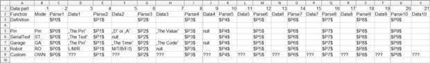 La aplicación envía los datos de 21 piezas en comparación a una cadena para Arduino. Entre todos los datos "reales" hay un bloque de análisis. La primera se llama "$P0$", el segundo "$P1$" y así sucesivamente hasta "$P9$".