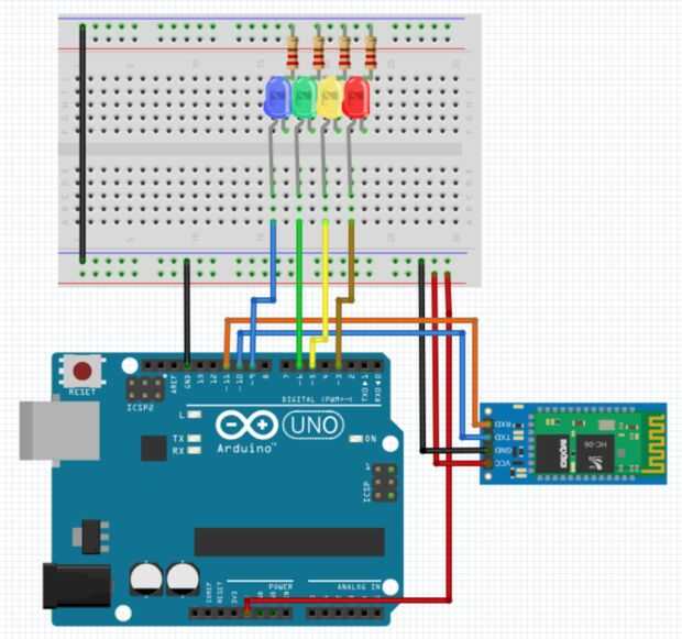 Es decir activar el "ON" relacionado con "1" botón del dispositivo, se enviará el mensaje de texto "dev1on" al Arduino. Al recibir este mensaje, el LED debe encenderse y así sucesivamente.