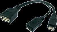 El cable OTG puede encontrarse en ebay, usando el término de búsqueda "Micro USB macho a USB hembra Host OTG Cable adaptador + Micro hembra Cable USB Y" encuentra buenos resultados.