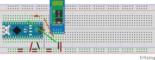 Ahora tendremos que conectar el RXD HC-05. Primero debemos establecer un divisor de voltaje utilizando el 2K y las resistencias de ohm de 4,6 K. Primero conecte un extremo de la resistencia de 2K con Arduino D2 conector, conecte el otro extremo a cualquier línea sin usar en el protoboard, entonces en esta línea conecta la resistencia K 4,6 y el otro extremo a la tierra. Ver la imagen de arriba.