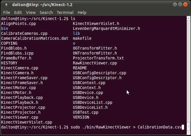 $ sudo ./bin/RawKinectViewer > CalibrationData.csv [si no ejecuta sudo - no se puede abrir dispositivo USB - Permiso denegado]