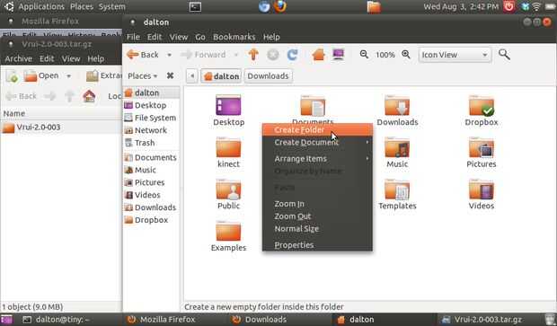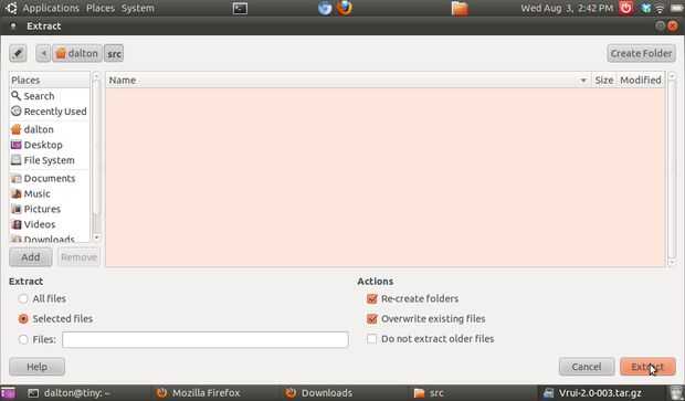 Esto abrirá el archivo en el administrador de archivo, desee desempaquetar lo que está en el archivo en la carpeta src. Tan bien volver a la pantalla de carpeta en el fondo y encontrar y abrir la carpeta src y arrastrar la carpeta Vrui-2.0-003 en el archivo en esa carpeta. O, haga clic en extracto, cuando el cuadro de diálogo preguntando extraer para localizar su carpeta de inicio (debe ser su registro en el nombre) y una vez allí, haga doble clic en fuente. Cuando Archive Manager tiene la carpeta de fuente abierta, haga clic en extraer. Cuando esté hecho, dejar de fumar.