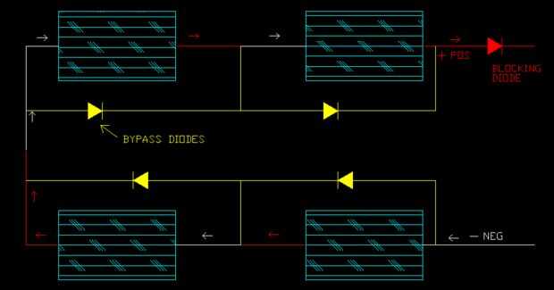 En la imagen inferior se conectan los paneles de la misma manera, el positiva a la negativa para llegar a 24 voltios. Además de diodo de bloqueo hay diodos de derivación. La razón de estos son permitir poder ir alrededor de un panel que está bajo la sombra de algo. Ayuda a mantener ese flujo correcto de energía, no que no fluyan de la manera correcta si su no hay.