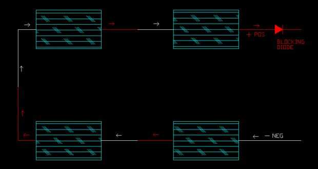 En este paso estoy mostrando como conectar paneles solares en una configuración de serie. Para este ejemplo vamos a decir que los paneles son paneles de 6 voltios en un sistema de 24 voltios. Mirando la imagen de arriba, desde abajo a la derecha etiquetado como – NEG. A continuación a la izquierda ves que fuera al otro lado del panel de la línea es de color roja, este es el lado positivo. Con este ser un panel de 6 voltios y necesitamos 24 voltios que necesitamos aumentar la tensión. Para ello conectamos el lado positivo del primer panel en el lado negativo del segundo panel. Ahora habrá 12 voltios que salen de este segundo panel. Continuando hasta el panel izquierdo superior, habrá 12 voltios en y que salen con 18 voltios. Esto continúa a través del cuarto panel en la parte superior derecha, habrá 24 voltios el venir hacia fuera si esta. También se puede ver el diodo de bloqueo. funciona del mismo modo como en el primer ejemplo a impedir la alimentación en los paneles de la espalda. Estos 4 paneles cableados de esta manera funcionan como si fueran un panel grande que produce 24 voltios. Tener un diodo de bloqueo es el mínimo que se necesita en el circuito.
