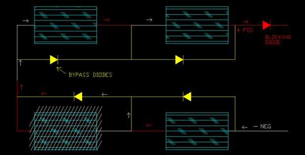 En este paso estoy mostrando lo que sucede cuando un panel está bajo la sombra de algo como un árbol. Verás que el panel izquierdo de la parte inferior es sombreado, por lo que el poder sigue el camino alrededor del panel bloqueado a través de los diodos de bypass. En esta configuración usted debe conseguir 18 voltios. Esto puede no ser de carga un sistema de 24 voltios muy bien, pero añadirá algo de carga a través de amperaje. Menos es mejor que nada. Si tienes un controlador de carga superior de final puede ser capaces de utilizar este voltaje inferior en alguna forma, o tal vez capaz de impulsar a los 24 voltios para mantener la carga. Necesita verificar las especificaciones en su controlador de carga especial.