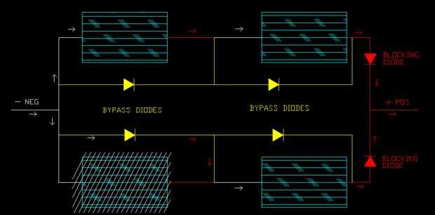 En este paso final estoy mostrando un ejemplo de un panel de sombra en una combinación paralela y configuración de cableado de serie. Se puede ver que la fila superior se ve afectada. En la fila inferior el panel de la izquierda es bajo la sombra de un árbol. La fila superior producirá 24 voltios, la fila inferior sólo producirá 12 voltios. Debido a los diodos de bloqueo al final de cada fila 24 voltios no se empuje hacia atrás en la fila de producción de 12 voltios. Se va a perder poder porque uno de los paneles son sombra, pero no van a volver. Usted todavía puede estar ganando en amperaje aunque sea en baja tensión si la batería tiene la carga, o si hay otro lugar para poder salir como a la iluminación o una herramienta. Otra vez, menos energía es mejor que ninguna energía de los paneles.