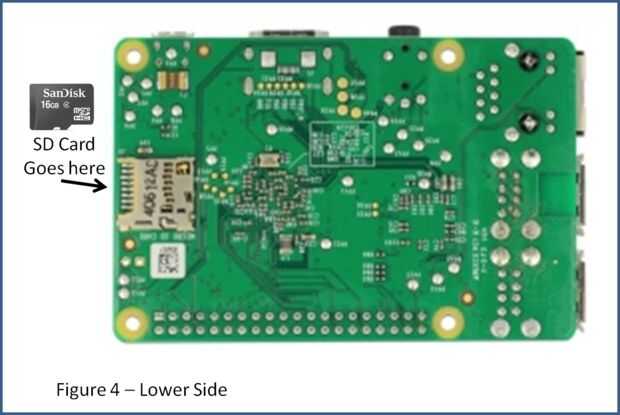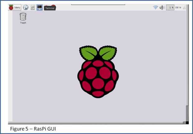 En cuanto a las conexiones de cable y adaptador de RasPi examinar la figura 3. Figura 4 ilustra la instalación de la tarjeta SD para el RasPi. Conecte el cableado e instalar los dongles. No conecte el micro-USB (el conector de alimentación RasPi) hasta el televisor y portátil se enciende. Después de haber encendido el ordenador portátil, conecte el conector de alimentación al RasPi. El TV debe mostrar el proceso de arranque del RasPi y entonces (darle tiempo) la GUI RasPi debe aparecer (Figura 5).