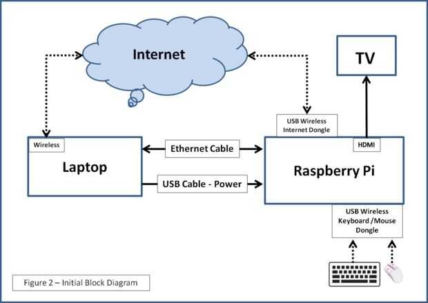 Figura 2 es un diagrama de bloques del sistema del ordenador portátil/RasPi inicial. Las líneas punteadas indican las conexiones inalámbricas a Internet y el teclado/ratón inalámbrico para el RasPi. El sistema final no requerirá la TV o el teclado/ratón inalámbrico.