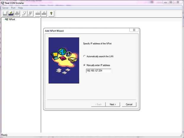 * Abra al asignador COM Real que formaba parte de la instalación y siga el Asistente para agregar el servidor. (Imagen 1) Limito a COM2 para la dirección IP del dispositivo servidor.
