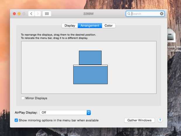En la ficha disposición, podrás colocar el monitor primario (uno más pequeño) y el monitor externo (el más grande cuadro azul). Arrastre los dos cuadros para mostrar la orientación de los monitores que aparecen en su escritorio. El rectángulo blanco en el cuadro de monitor externo (el cuadro azul más grande en la parte inferior) es que monitor su barra de menú se encuentra. Puede hacer clic y arrastrar esto a otras posiciones, así.