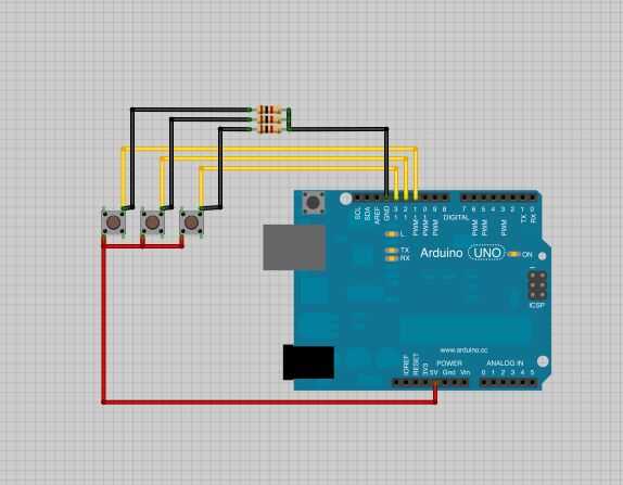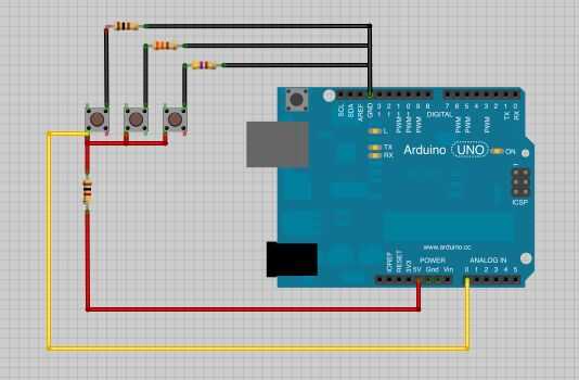 También es útil el hecho de que pulsando dos botones al mismo tiempo producirá un valor completamente independiente. Basado en la ecuación para resistencias paralelo, R = 1/1/R1 + 1/R2... 1/Rx, podemos determinar que los botones uno y dos presionados juntos producirá una resistencia total de 1/100 + 1/330 = 1/R, entonces solucionando para R, el resultado es alrededor 77 ohmios. Que conecte la fórmula del divisor de tensión con 77 ohmios como R2, {77 / (1077)} * 5 = 0.35V, obtenemos una lectura de voltaje completamente nuevo. Posibles usos incluyen ser capaz de leer diagonales en palancas de mando que utilizan botones, como este: https://www.sparkfun.com/products/9182, sin varios if... entonces... if else declaraciones sobre Arduino.