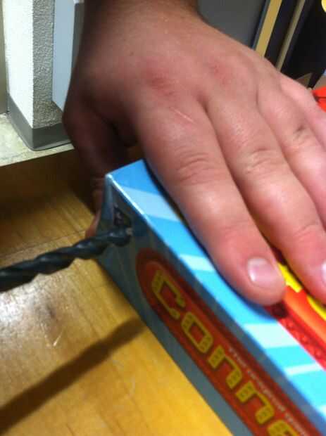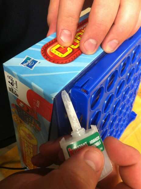 Una vez que hayas hecho esto, saque su pegamento y aplique una tira de pegamento a lo largo de los bordes de las dos cajas. Debe secar unos 5 minutos, así que no te preocupes - ¡ estamos en el buen camino. Esto le dará suficiente apoyo para que la caja no caiga una vez que estamos. Si usted sólo había empujado la caja superior e inferior junto como normal, el peso de la electrónica y la tabla 4 conectar hará la configuración entera volcarse. Esto es un simple "truco" para evitar ese resultado desastroso y nos ayuda a utilizar cada pieza del juego original!