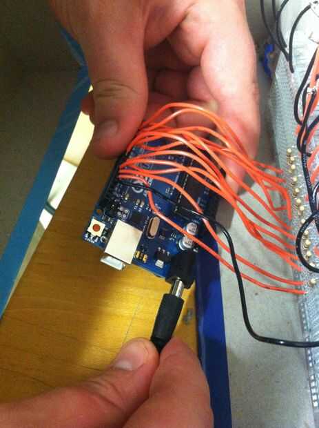 Tome el cordón de alimentación y se alimentan a través de ese agujero y conectar el Arduino! Debería ver luz de unos LED en la cara frontal de la caja - si no pasa nada, hay dos posibles causas: 1. te perdiste una conexión soldada en el LED o la placa (no debería ser el LED, porque se comprueban en el paso 4, derecha?), o 2. hay un error en el código. Si estás seguro que no te pierdas una conexión (Asegúrese de que todos son tierra!), revise de nuevo. Si estás todavía seguro después de eso, vuelva a descargar el código del paso anterior y subirlo otra vez.