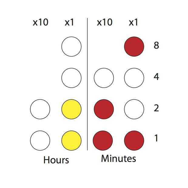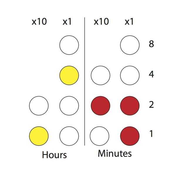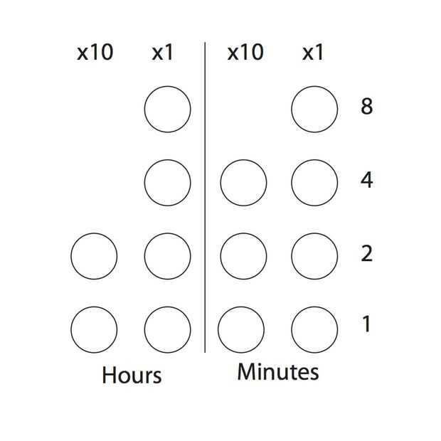 La columna de la izquierda se corresponde con el primer dígito en la lectura de minutos (es decir, el "2" en 25 minutos), o el "5" en 51 minutos, por esta razón el multiplicador de "x10" destaca. La columna de la derecha representa la segunda cifra (es decir, el "5" en 25 minutos). Cuando múltiples LED se enciende en una columna, simplemente agregue estos números para obtener el total. Por ejemplo, en la columna de minutos, en la columna "x 10", si el "2" LED se enciende y en la columna "x 1", "8" y "1" LED se enciende, la cifra resultante es 20 + 8 + 1 = 29 minutos. La misma lógica se aplica a la columna de horas (nota que hay no un LED de la fila "4" para los dígitos de horas - esto es porque, incluso en un reloj de 24 horas, no hay que ir por encima de los años 20!).