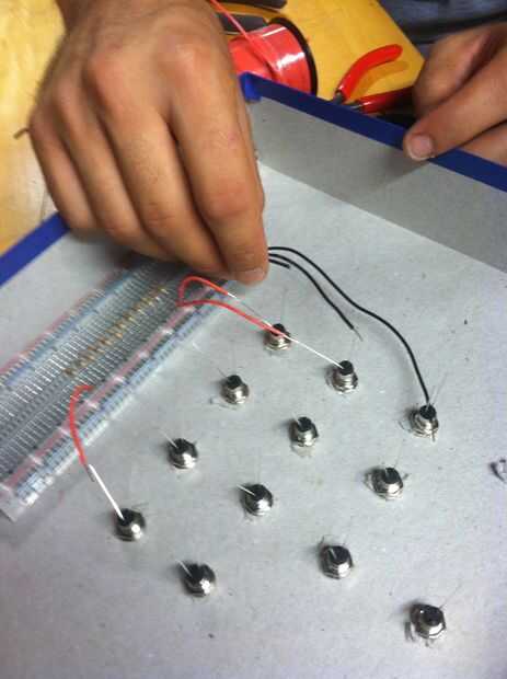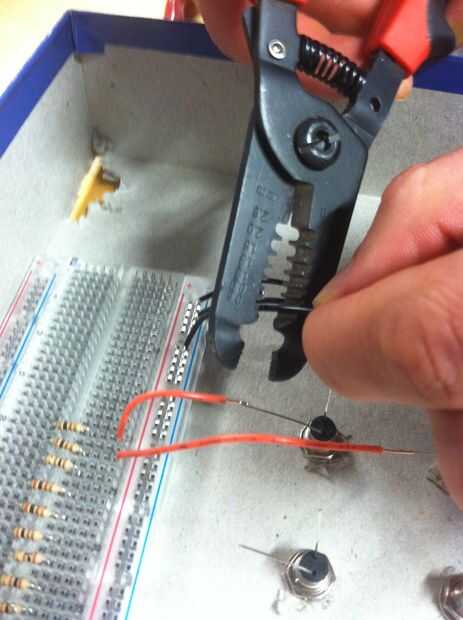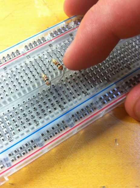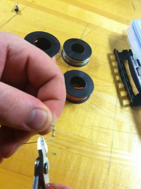 Ahora que la placa se une a la caja, obtener sus hilos hacia fuera y empezar a medir un positivo (rojo) y negativo (negro) longitud de cable de cada resistor para cada LED. Debe Conecte el terminal positivo de cada LED a uno de los 13 resistores en la protoboard. El cable de tierra del LED puede conectarse al carril de tierra universal en el protoboard. Después de que los cables se miden, uno de los extremos del palillo en la protoboard y gire el otro extremo alrededor de la cabeza LED apropiado.