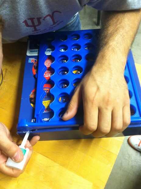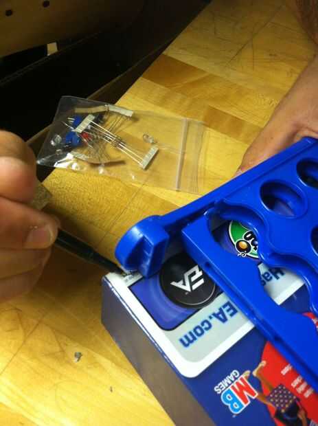 Toma un Sharpie y trace una línea alrededor del exterior de los pies. Una vez hecho esto, coge cualquier hoja disponible y corte a lo largo de la traza - no te preocupes el corte siendo perfecto - cualquier imperfección se va a ocultar detrás de la Junta cuando adhiera. Esto permitirá que la Junta 4 Conecte a mentir al ras con el tablero. Aplicar una pequeña cantidad de pegamento a los lados del conectar 4 donde se encuentra con el cuadro se asegurarán de no mover y hacer una robusta base para nuestro reloj binario.