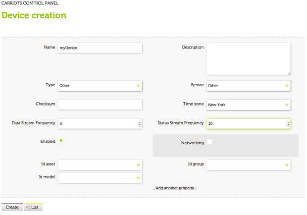 En este paso crearemos un nuevo dispositivo en Carriots para controlar el Consejo de estado. Si tienes un dispositivo existente, puede trabajar a través de este tutorial utilizando el dispositivo. Incluso si usted tiene un dispositivo existente, recomendamos leer el resto de este paso para estar seguro que tienes configuraciones de dispositivo configurados correctamente.