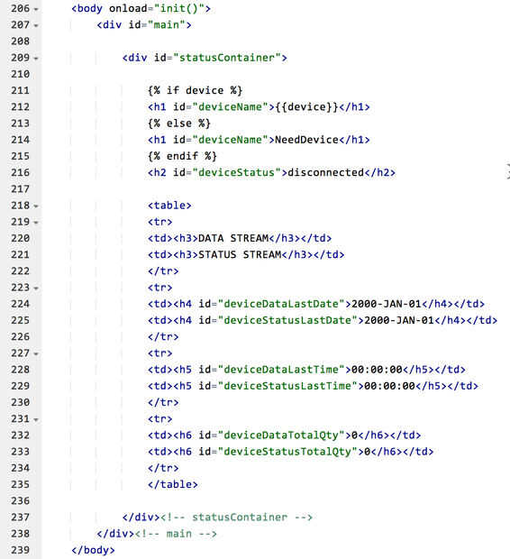 Tal vez el archivo más fácil de entender es status.html. Este archivo es esencialmente la mini página que se llama Consejo de estado. Este archivo en particular, se configura como una plantilla en frasco. Eso significa que los datos de nuestra aplicación web está poblados en esta plantilla antes de que se sirve.